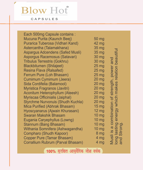Blow hot capsules helps in increasing the feeling of manhood.improves vigour and vitality and libido.improves and maintains penile erection.the antistress and adaptogenic actions of blow hot help alleviate anxiety associated with sexual performance.