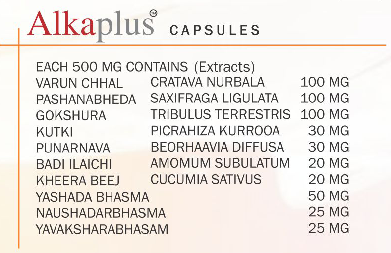 In Urinary Stones Alkaplus Capsules are to be taken two capsules once daily empty stomach for Nine