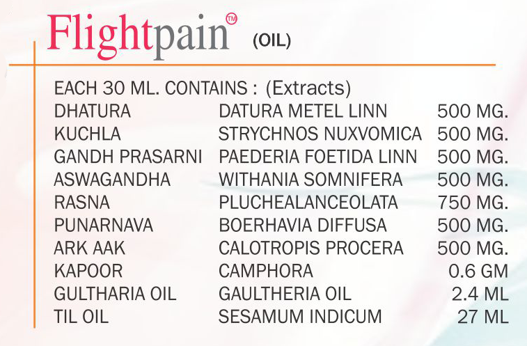 FlightPain oil is a unique formulation which is rarely seen. Contains ingredients like Dhatura, Kuchla,