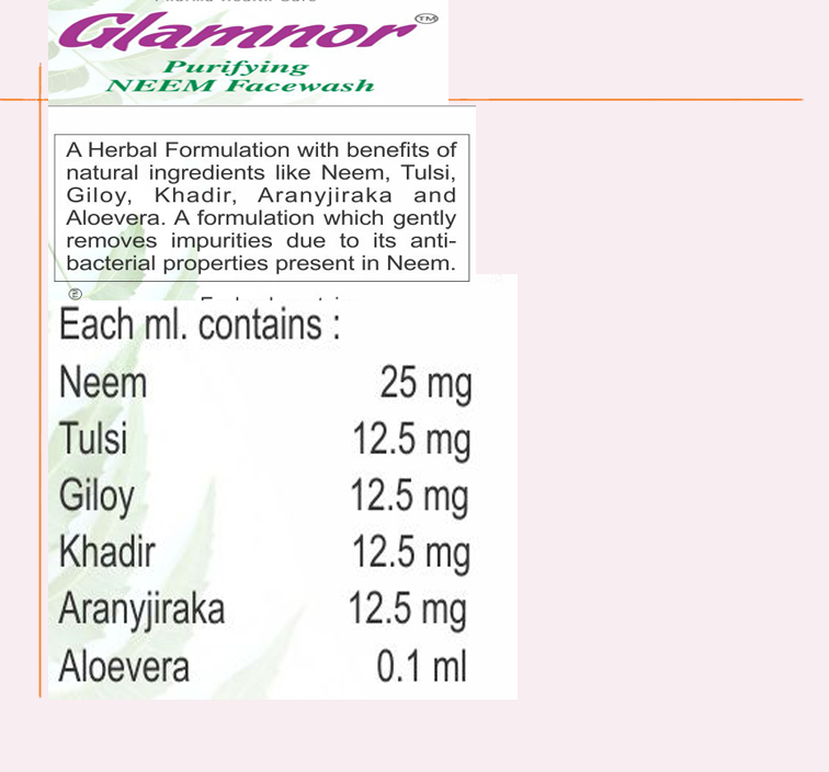 Glamnor face wash contains ingredients like-neem,tulsi,giloy,khadir,aranyjiraka,and aloevera.