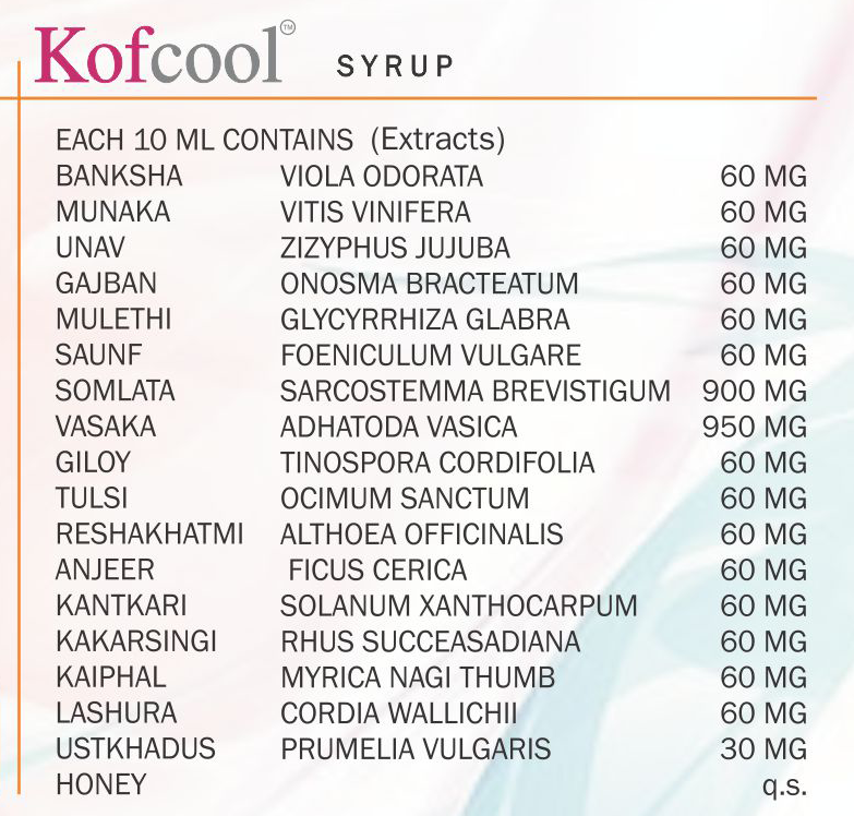 Kakarsinghi, Lasuras And Ustakadus which is rarely seen in other cough syrups. Kofcool Contains Pure