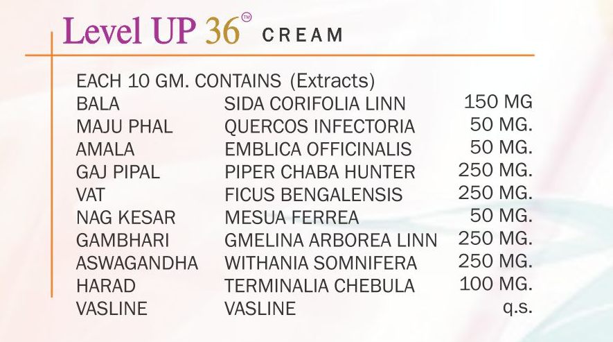 size of Breasts. LevelUp 36 cream tones up the muscle structure, stimulates growth of new cells and maintains proper shape of Breasts. Also Level Up 36 cream can be used by Mature Ladies who also wants to strengthen and give nourishment to loose skin of Breasts. The Cream is to applied twice daily in circular motion on both the Breasts and from upper abdominal region towards Breasts and also from