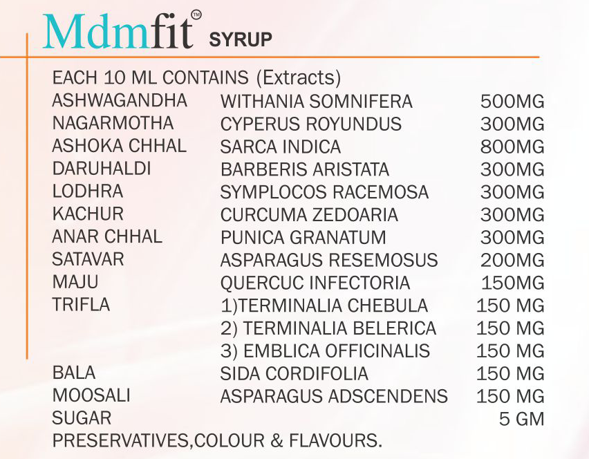 along with other Menstural problems. Mdmfit Syrup protects feminine health and harmony.