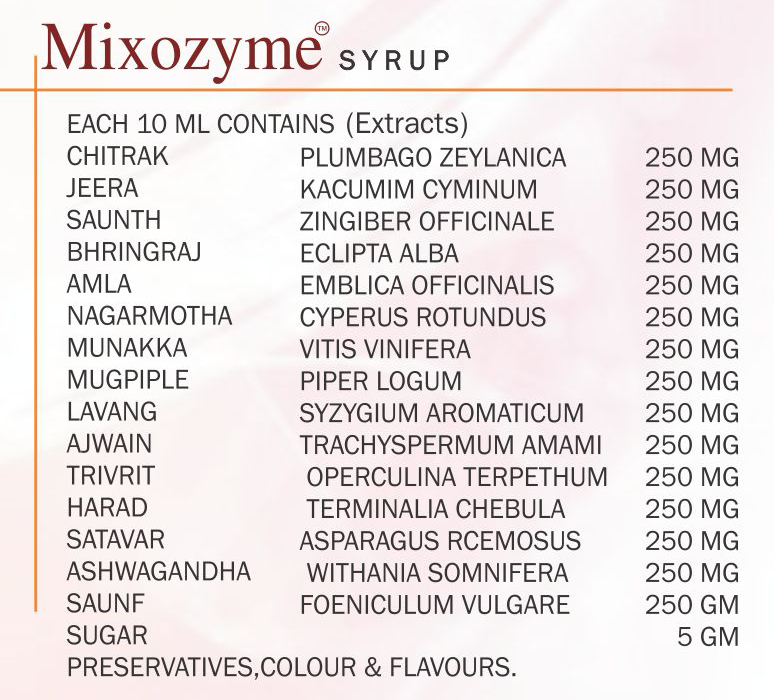 In various digestive disorders Mixozyme Syrup is a unique formulation for all age groups. Enzymes which are generally given In allopathy contain mainly Fungus Diastase and dead animal base. They only provide temporary relief and are difficult to take as their flavor changes due to oxidation. Whereas Mixozyme contains all natural ingredients which are regularly used in our diet like Jeera, Saunth, Lavang, Ajwain, Munkka, Amla, Saunf and various other things. These Ingredients in Mixozyme basically enhance our own digestive tract and our body starts forming natural enzymes which are generally required.