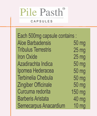 The anti-inflammatory and anti-infective actions reduce inflammation,check infection’and promote healing.the laxative property of pile pasth capsule corrects constipation associated with piles..