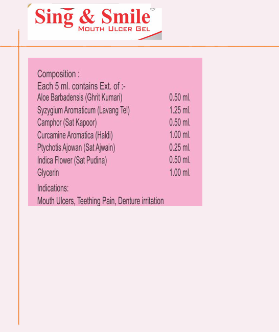 Apply 3-5 drops of sing & smile gel over affected area with clean fingure tip for two to three times or as directed by physician. Provides soothing effect on the ulcers and checks irritation and provides quick relief.